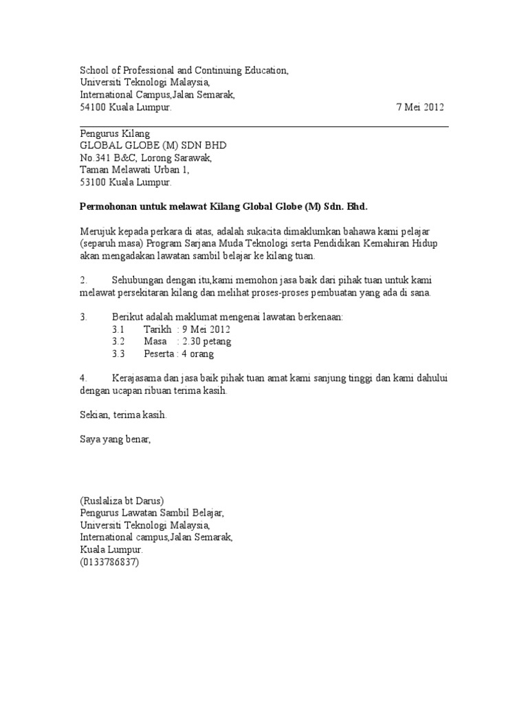 Surat Permhonan Lawatan Ke Petrosains Pdf